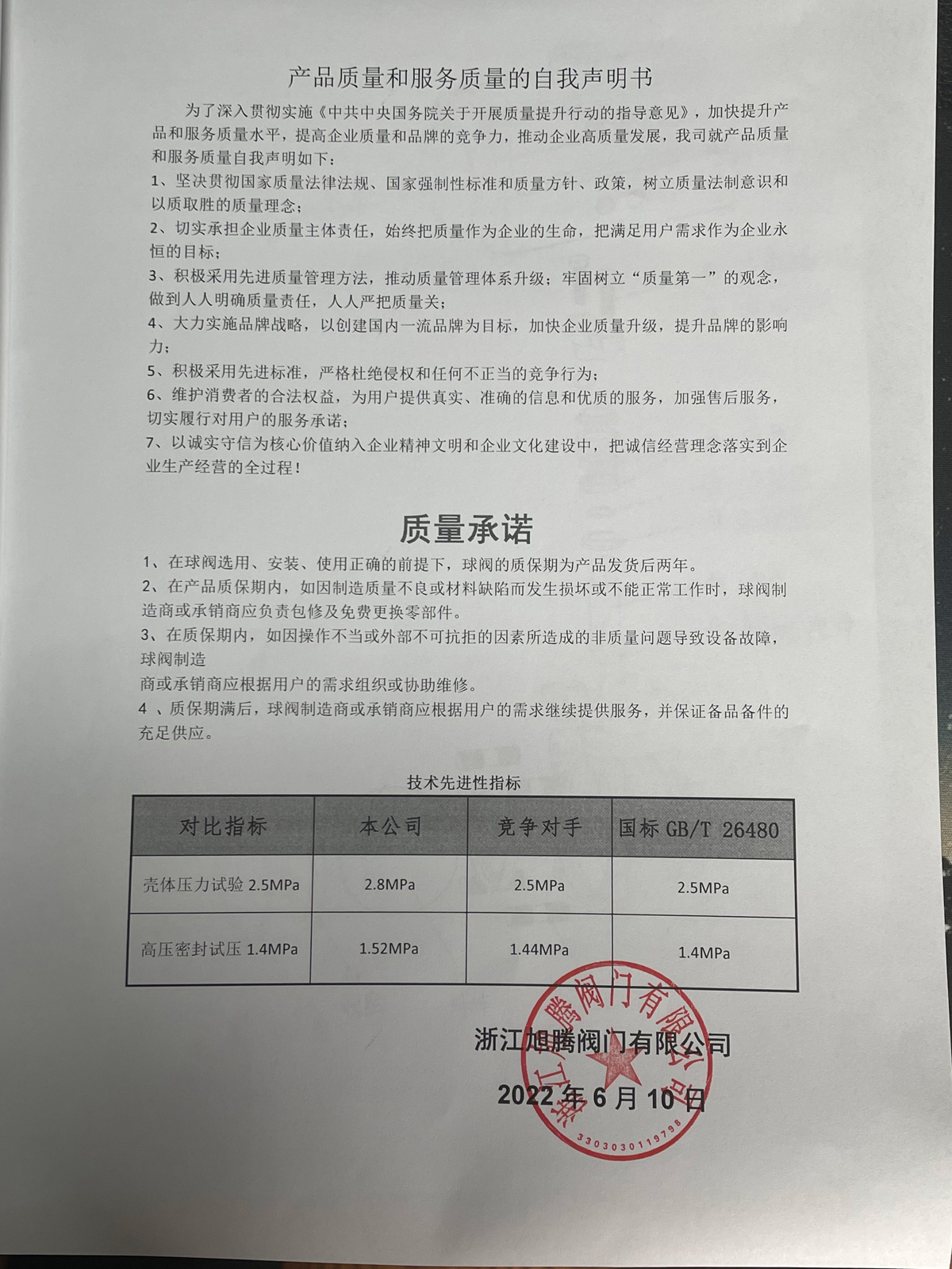 產品質量和服務質量的自我聲明書